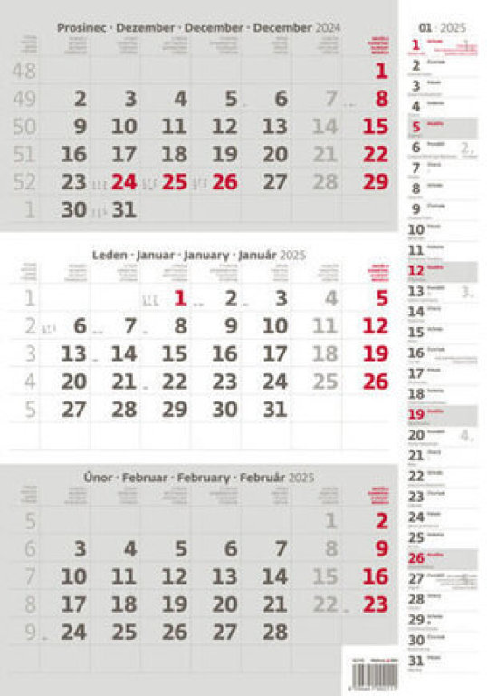 Tříměsíční kalendář šedý s poznámkami 2025 - nástěnný kalendář