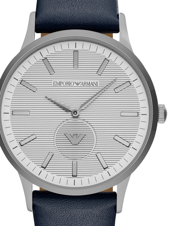 Klasické hodinky Armani (Emporio Armani) z kolekcie Renato. Ideálny doplnok pre mužov uprednostňujúci analógové a guľaté hodinky. K ich skrášleniu naviac výrobca zvolil. Vo vnútri odolného, 9 mm vysokého púzdra, ktoré tvorí kvalitný oceľ nájdete spoľahlivý batériový (quartz) strojček poháňajúci v priemere 43 mm široký ciferník. Ten spoľahlivo chráni odolné minerálne sklíčko. Ako sami vidíte, púzdro zahalila strieborná, ciferník strieborná a remienok modrá farba. Z hľadiska materiálu vedie kože a jeho dĺžku, v tomto prípade 220 mm si môžete ľahko upraviť na obvod svojho zápästia. Tieto hodinky disponujú stupňom vodotesnosti 5 ATM.Až 80 % zľava na stovky výrobkov! Black Friday je tu!