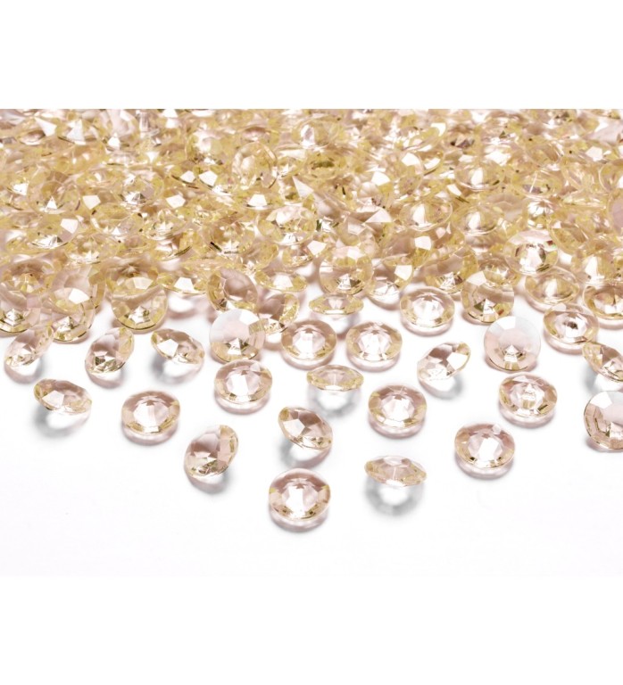 Dekoratívne kryštáliky v zlatej farbe na výzdobu večierka alebo sviatočnej tabule. Počet kusov v balení: 100 Priemer: 12 mm.