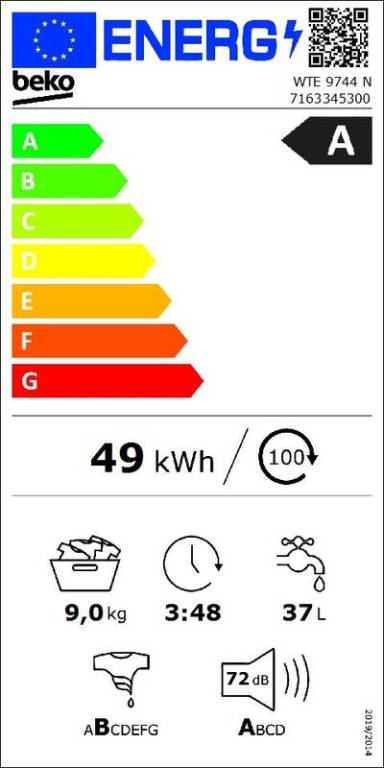 Beko WTE9744NBeko WTE9744N je spredu plnená práčka s kapacitou až 9 kg a unikátnou štruktúrou bubna AquaWave na šetrné pranie. Vďaka dostatočnej kapacite je práčka ideálnym pomocníkom aj pre domácnosti s viacerými členmi. Vybavená je parou SteamCure, ktorá lepšie odstráni škvrny a zanechá bielizeň menej pokrčenú. Iste oceníte možnosť pridať kúsky oblečenia počas prania, samočistiaci program práčky DrumClean+ alebo prídavnú funkciu Fast+ zrýchľujúcu pranie pri niektorých programoch až o polovicu času. Na hodnote jej pridáva aj praktické vnútorné osvetlenie. Nechýba ani funkcia odloženého štartu až o 24 hodín. NajúspornejšiaInvestujte do spotrebiča v najúspornejšej energetickej triede A, aby vám pomohol udržať nízky účet za elektrinu. Spotreba energie za 100 cyklov dosahuje 49 kWh a spotreba vody za jeden cyklus je iba 37 litrov. Pri maximálnej rýchlosti 1 400 otáčok za minútu neprekročí hlučnosť 72 dB. Srdcom práčky Beko je spoľahlivý ProSmart™ invertorový motor s veľmi tichou prevádzkou a nízkou spotrebou energie, ktorý zaručuje dlhoročnú životnosť spotrebiča. Určite vás tiež poteší, že Beko ponúka rozšírenú 10-ročnú záruku na tento motor.