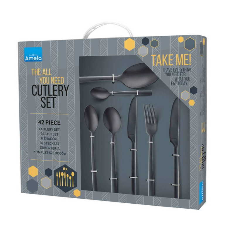 Elegantná sada príborov z nehrdzavejúcej ocele v čiernej farbe predstavuje nepostrádateľný doplnok na vašu sviatočnú, ale aj všednú tabuľu. Čierne príbory totiž ľahko skombinujete so sviatočným servisom po babičke, ale na strane druhej nimi pozdvihnete na novú úroveň aj celkom obyčajný biely porcelán. Vychutnajte si nedeľný obed štýlovo!Tieto príbory je možné umývať v umývačke riadu, ale použite čistiaci prostriedok s obsahom fosfátov 3 % a menej a umývací program s teplotou 40 °C alebo nižšou. Prednosť sa dáva ručnému umývaniu pre zachovanie vzhľadu, lesku. Obsah sady: 6x jedálenský nôž 6x steakový nôž 6x vidlička 6x lyžica 6x lyžička Latté / Sorbet 10x čajová lyžička 2x lyžica na zeleninu.