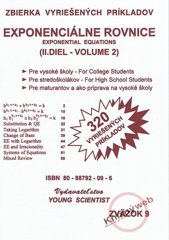 Obsahuje 320 vyriešených príkladov a je pokračovaním prvého dielu, zväzok 8. V kapitole šesť upravujeme členy ľavej strany rovnice na jeden základ, pretože na pravej strane je vhodné číslo, ktoré sa dá upraviť na ten istý základ. Pomocou algoritmu: ak sú základy rovnaké, tak sú rovnaké exponenty, získavame riešenie. V kapitole sedem riešime analogické príklady, kde na ľavej strane rovnice sú dva činitele. V ôsmej kapitole máme členy na ľavej aj na pravej strane rovnice s rôznymi základmi. Ak na jednu stranu prenesieme členy s tým istým základom a analogicky aj na druhú stranu s druhým základom, potom po úprave už môžeme využiť vyššie spomínaný algoritmus. V deviatej kapitole exponenciálnu rovnicu transformujeme na kvadratickú, ktorú riešime, pričom nezabúdame na skúšku. V desiatej kapitole riešime exponenciálne rovnice logaritmovaním oboch strán, v jedenástej kapitole využívame zmenu bázy. Príklady v dvanástej kapitole majú logaritmickú funkciu v exponente, v trinástej sú členy pod odmocninou. Riešeniu sústavy dvoch exponenciálnych rovníc o dvoch neznámych je venovaná štrnásta kapitola. Pätnásta kapitola obsahuje zmes rôznych príkladov.Vydané dňa: 20.10.2010Vydanie: 1.Väzba: brožovanáISBN: 978-80-8879-209-3Strán: 65Formát (mm): 104x151.