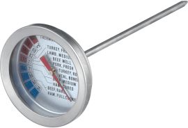 GRILOVACÍ NÔŽ Rozmery: dĺžka noža 12 cm MATERIÁL: oceľ FARBA: strieborná, čierna Teplomer je vyrobený zo sondy z nehrdzavejúcej ocele, ciferník je vyrobený z hliníkového rámu a skla. Teplomer je určený na meranie teploty vložením do požadovanej potraviny, čím sa dosiahnu presné výsledky. Termometer nepoužívajte opakovane, ak je sklo poškodené. Teplomer meria v °C a °F. Termometer má aj príslušné hodnoty pre potraviny.