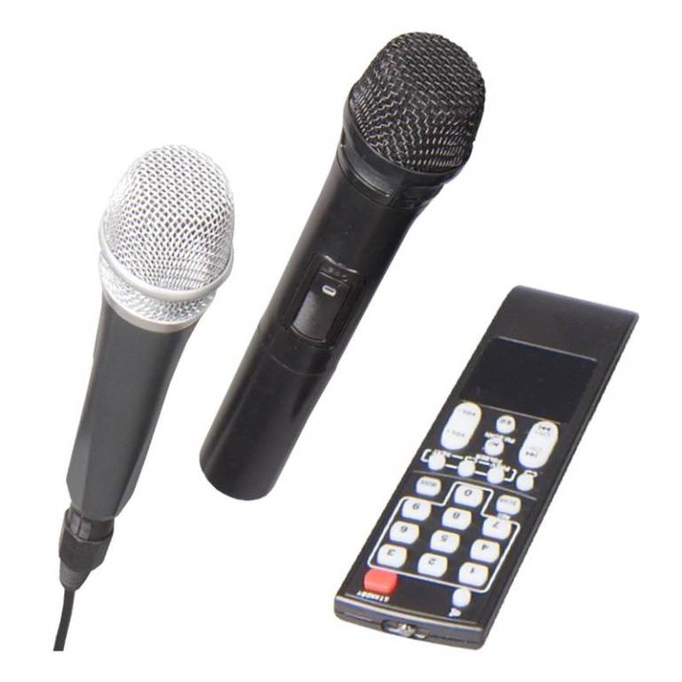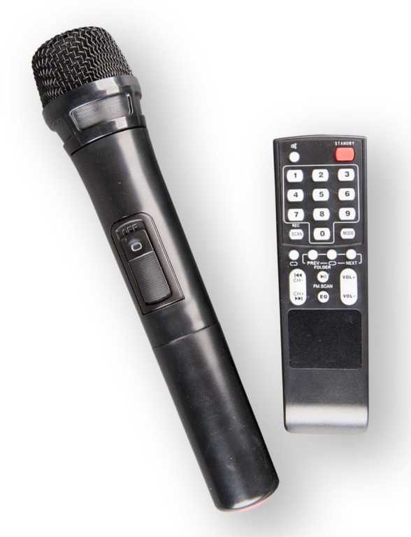 Bluetooth reproduktor bezdrôtový, FM tuner, MP3, USB, microSD (max. 32GB), bluetooth, vstup pre mikrofón/gitaru, funkcia karaoke, možnosť nahrávania, výdrž na batériu až 8hod, napájací adaptér, bezdrôtový mikrofón, diaľkový ovládač