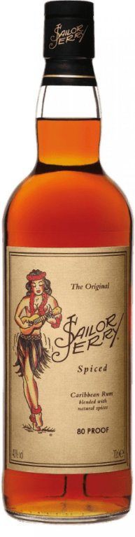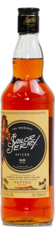 Sailor Jerry Spiced, 0.70L, 40%, Panenské ostrovy.Sailor Jerry Spiced Caribbean rum je koreneným karibským rumom, ktorý obsahuje podľa pôvodnej receptúry zázvor, škoricu, klinček, vanilku a infúziu prírodnej limetky. Námornícky rum, na ktorého etikete je vedľa fotografie a životopisu Sailora Jerryho aj jeho typická "hula girl”.Tento senzačný rum, pripomínajúci svojou chuťou perník, sa destiluje na Panenských ostrovoch. Na vnútornej strane zadnej etikety je vytlačená séria rôznych motívov, ktoré sú viditeľné len po vypití tohto lahodného moku. Práve kvôli týmto zadným etiketám sa Sailor Jerry Spiced Rum stal v USA zberateľskou atrakciou.Sailor Jerry.Námorník Jerry strávil polovicu života na mori a druhú polovicu tetovaním námorníkov. Jednoducho povedané, dvaja nadšenci pre Sailora Jerryho založili spoločnosť využívajúc jeho motívy tetovaní. Logickým vyústením ich práce bolo aj vyrábanie koreneného rumu v Jerryho mene, ktorý čoskoro predčil všetky ostatné artikle Sailor Jerry.