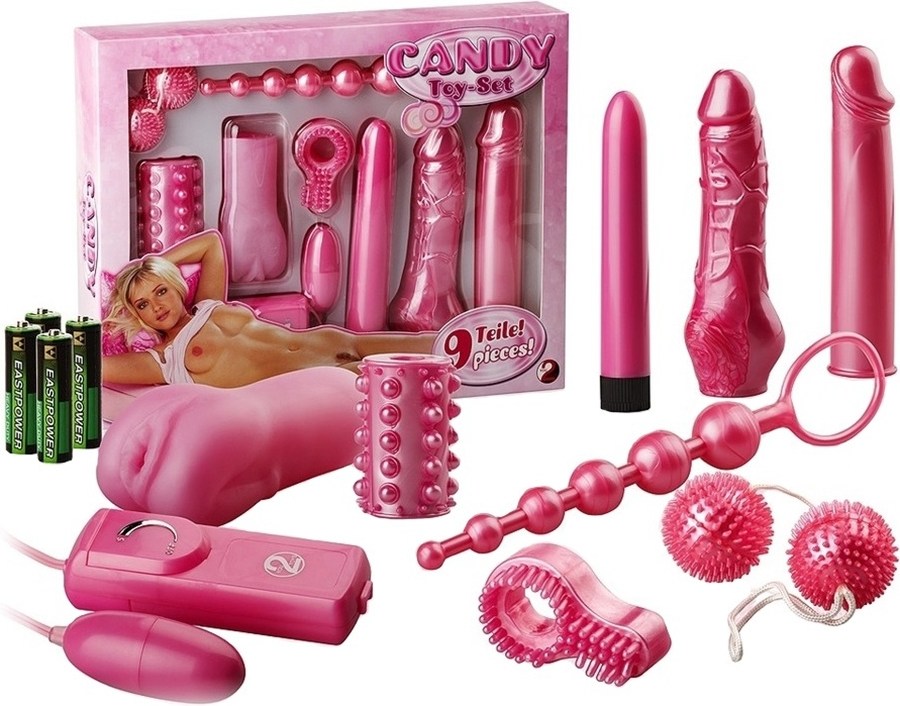 Sladká 9- dielna sada v ruovom prevedení. Vibrátor (dåka 15 cm, priemer 2,3 cm, napájanie 2 x AA batérie, regulovate¾né vibrácie, hladký povrch) Návlek na vibrátor (dåka 16 cm, priemer 2,8 cm, gélový materiál, hladký povrch, tvarovaný aluï ) Dildo (dåka 17,5 cm, priemer 1,5 - 3,5 cm, tvarovaný aluï, jemné ilkovanie ) Venuine gulièky (priemer 2,8 cm, nopkovaný povrch) Vibraèné vajíèko (dåka 6 cm, priemer 2,3 cm, hladký povrch, napájanie 2x AA, plynulá regulácia vibrácií) Elastický návlek na penis alebo vibrátor s výstupkami Erekèný a stimulaèný krúok na penis Análne perly (dåka 15 cm, 6 gulièiek s rozvíjajúcim sa priemerom 0,7 - 2,1 cm, pútko pre ¾ahkú manipuláciu ) Vagína ( ruèný masturbátor v tvare vagíny z príjemného materiálu, dåka 10 cm ) Batérie sú súèasou balenia.