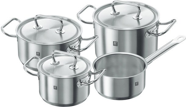 POPISSada nerezových hrncov z rady Twin Classic od výrobcu Zwilling obsahuje rajnicu s priemerom 16 cm a objemom 1,5 l, kastról s pokrievkou o priemere 20 cm a objemom 3 l, hrniec s pokrievkou s priemerom 20 cm a objemom 4 l a hrniec s pokrievkou o objeme 2 l a o priemere 16 cm.Riad je vyrobený z nerezovej ...viac