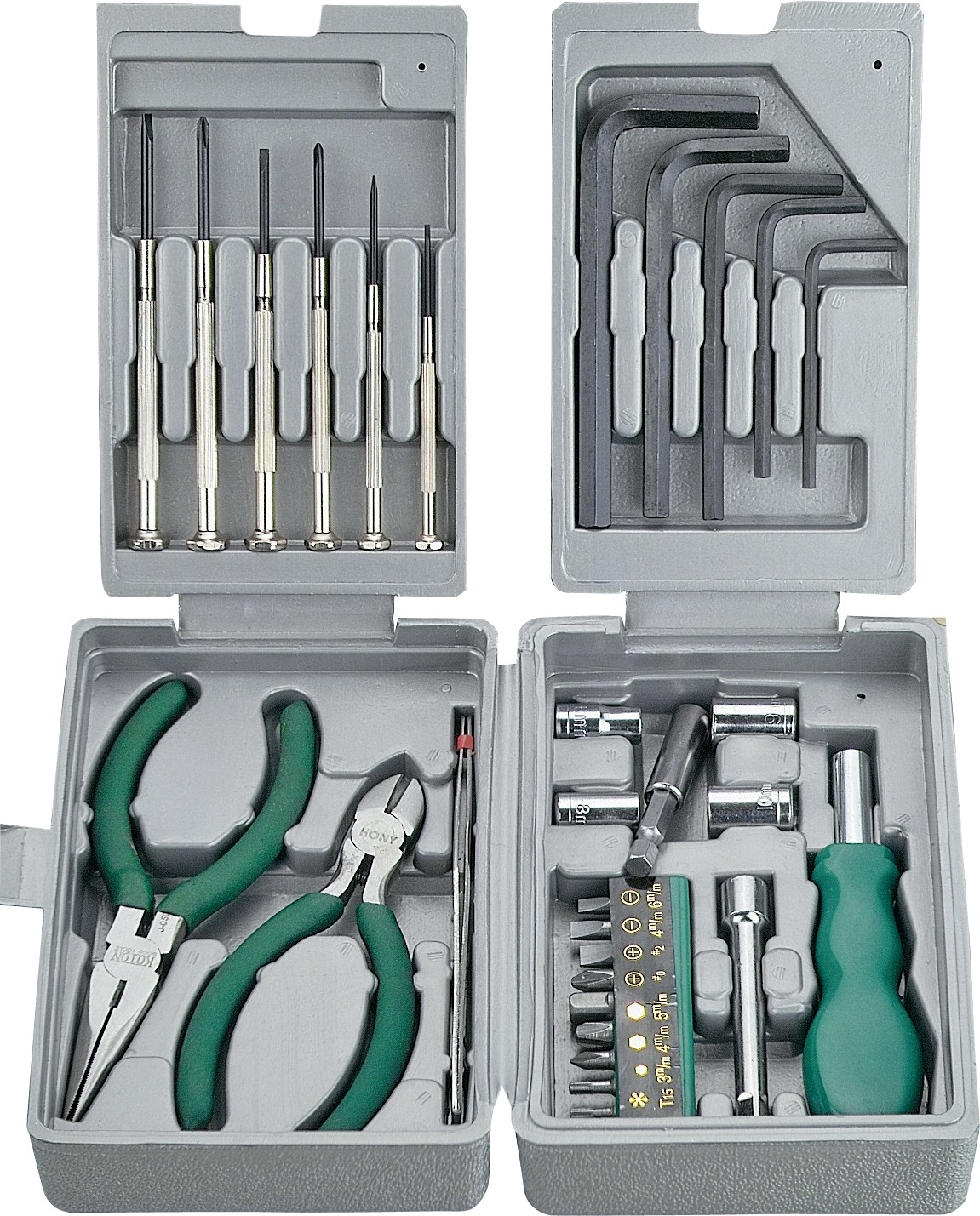 Súprava náradia Sada náradia pre domácich majstrov, určená na opravu a údržbu elektroniky a počítačov. Obsahuje precízne skrutkovače malých rozmerov vhodné napríklad k demontáži pevného disku z notebooku, kvalitné pinzetu, sadu klieští a skrutkovač s vymeniteľnými koncovkami. Všetky nástroje sú bezpečne ...viac
