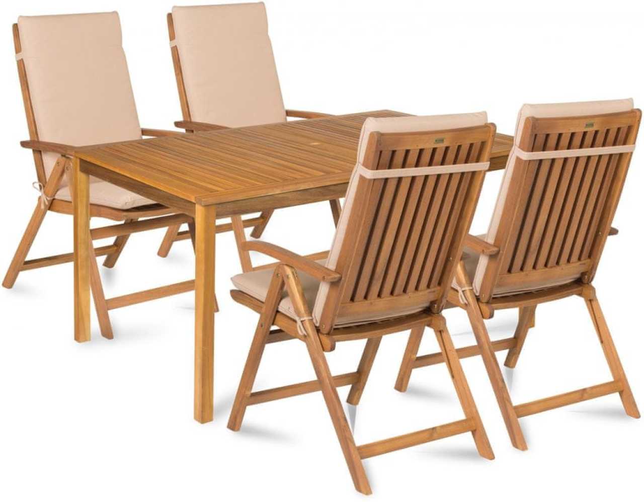 Zostava záhradného nábytku z exotickej dreviny Fieldmann CALYPSO. Súčasťou sady je stôl s rozmerom 150×90 cm do ktorého možno vďaka otvoru umiestniť slnečník. Sada nábytku ďalej obsahuje 4 kusy polohovateľných kresiel a 4 krémové podušky.