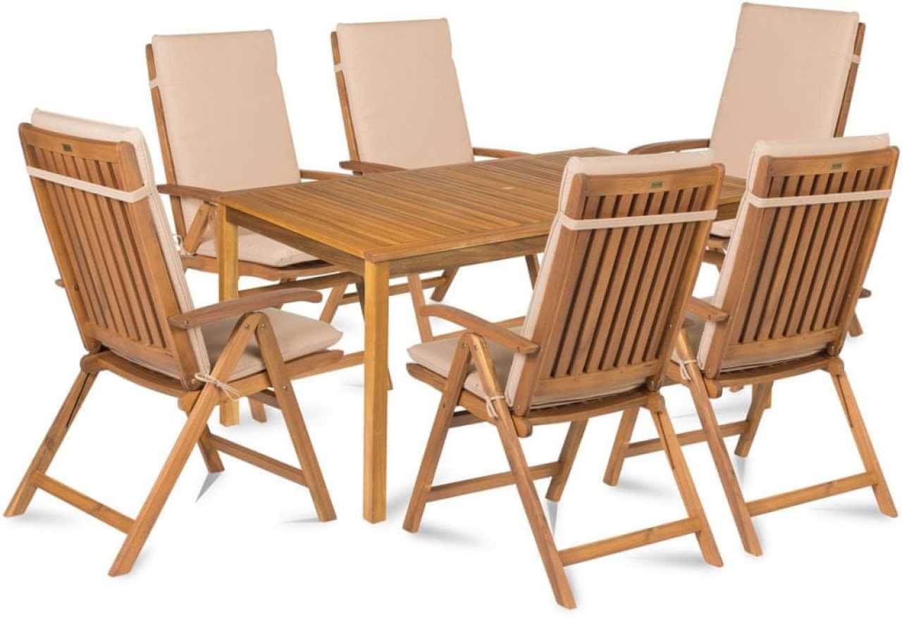Zostava záhradného nábytku z exotickej akácie. Súčasťou sady je stôl s rozmerom 150 × 90 cm do ktorého možno vďaka otvoru umiestniť slnečník. Sada nábytku ďalej obsahuje 6 kusov polohovateľných kresiel s polstrami.