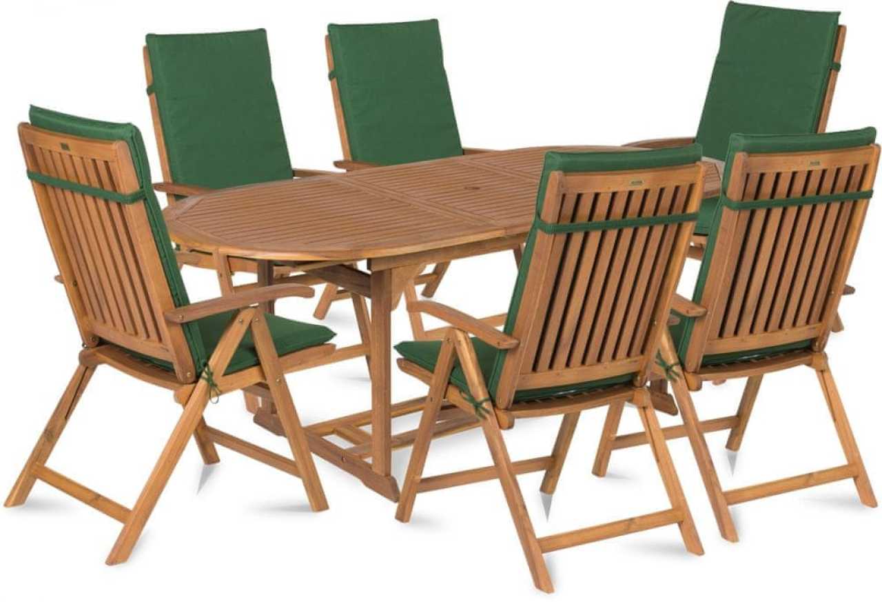 Záhradný set nábytku vyrobeného z exotického dreva akácie. Set má oválny rozkladací stôl s otvorom pre slnečník. Set sa skladá z jedného stola a 6 ks stoličiek pre Vaše maximálne pohodlie.