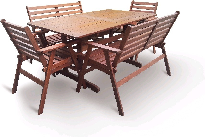 Záhradný nábytok – stolová zostava – 2 kreslá, 2 lavice a stôl z tvrdého a trvanlivého dreva meranti, rozmery stola 150x90x74cm, rozmery kresiel 59x63x86cm, rozmery lavica 120x63x86cm Luxusná stolová zostava z exotického dreva meranti, ktorá vás uchváti svojim elegantným vzhľadom a poteší dlhou životnosťou. ...viac