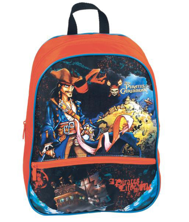 JUNIOR BATOH - PIRÁTI Z KARIBIKU Batôžtek je svojou veľkosťou určený pre deti predškolského veku a malých školákov na voľný čas. Batoh má jednu veľkú kapsu a jednu malú kapsu. Popruhy sú polstrované a dajú sa dĺžkovo nastavovať. Batoh má tiež ušku pre prenášanie v ruke alebo zavesenie. ROZMERY: výška 33cm, šírka 25,5 cm, hĺbka 10,5 cm VÁHA: 0,215 kg NOSNOSŤ: 2kg.