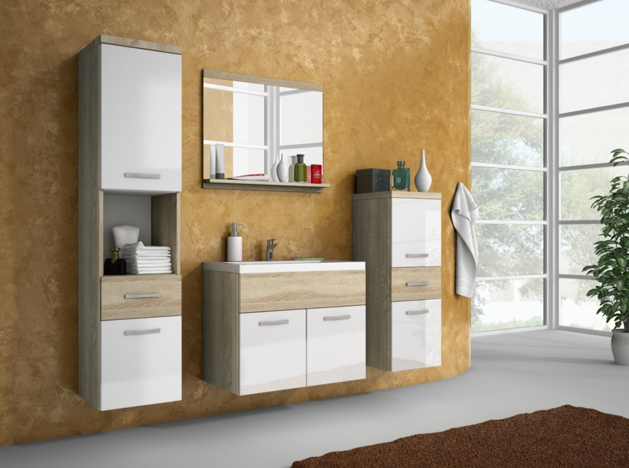 Nový nábytok do kúpeľne je potrebné vyberať zvlášť starostlivo, pretože sa jedná o náročné prostredie. Na druhú stranu vás nová kúpeľňa môže vyjsť veľké peniaze, ale rovnako dlho nevydrží. Preto pre vás máme optimálne riešenie v podobe moderného nábytku do kúpeľne Horace 1.Táto kúpeľňová zostava je vyrobená z pevného lamina, ktoré umožňuje vytvárať jedinečne kompaktné povrchy so širokými možnosťami ďalších úprav. K dispozícii sú dve farebné prevedenia. Zostavu si môžete zaobstarať s umývadlom, alebo bez neho.Základnými komponentmi zostavy sú tri závesné skrine a samozrejme zrkadlo. Najväčšia kúpeľňová skriňa má na výšku 133 cm. V jej spodnej časti je jedna hlboká zásuvka a nad ňou druhá zásuvka štandardných rozmerov. Vysoký otvorený regál je ideálny na vystavenie dekorácií. Horná časť zakrytá dvierkami obsahuje dve police. Skrinka pod umývadlo je klasicky riešená priestranná skriňa bez vnútorného členenia vhodná na uskladnenie čistiacich prostriedkov do kúpeľne. Menšia závesná skrinka je členená do troch zásuviek. Kúpeľňové zrkadlo má k dispozícii malú poličku na odloženie osobných vecí vašej rodiny. Inšpirácia nábytkom do vašej kúpeľne pre moderný domov.Pretože nepoznáme presný typ muriva vo vašej domácnosti, necháme výber spojovacieho materiálu na uchytenie na stenu na vás (v balení ho teda nenájdete).Rozmery (š/v/h):.vysoká skrinka: 30/133/30 cm.skrinka pod umývadlo: 60/47,5/34,6 cm.stredná skrinka: 30/83/30 cm.zrkadlo s policou1: 60/50/11,5 cm.Ďalšie parametre a vlastnosti:.materiál: LTD.farebné prevedenie: dub sonoma + biely lesk.