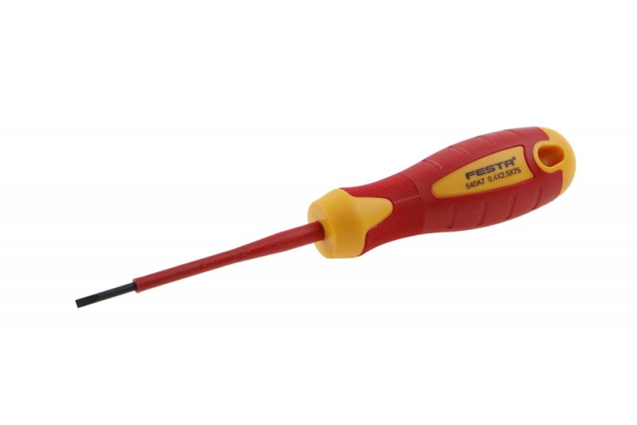 Skrutkovač má certifikáciu elektro VDE 3x75 S2 FESTA 1000V, IEC / EN 60900-2004, kovový driek je vyrobený z veľmi kvalitnej chromvanadiové ocele, kalený hrot je magnetický, kombinácia polypropylénu a gumy na ergonomicky tvarované rukoväte zaručuje výborné antišmykové vlastnosti a dobrú odolnosť voči ...viac