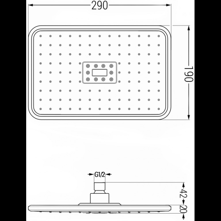 Technické údaje: Materiál: plast Povrchová úprava: chróm / biela Rozmery: 29x19 cm Hrúbka: 2 cm Štandardné pripojenie G 1/2 " Sprchová hlavica obsahuje gumové trysky, ktoré zabraňujú usadzovaniu vodného kameňa. Táto sprchová hlavica doplní vašu kúpeľňu. Vďaka tomu je váš každodenný rituál oveľa príjemnejší.