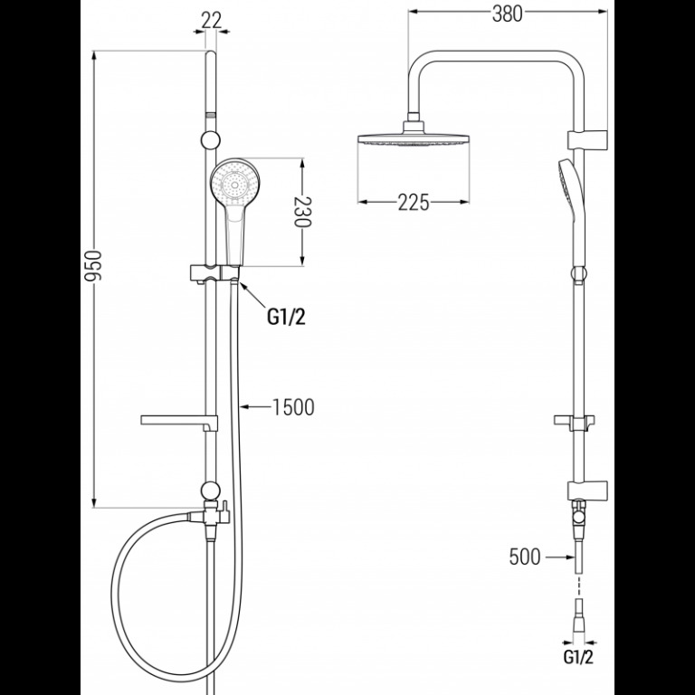 Technické dáta: Materiál stĺpika: Nerezová oceľ, ABS Povrchová úprava stĺpika: Chrome Výška: 950 mm Šírka stĺpika: 22 mm Vzdialenosť od steny: 380 mm Miska na mydlo Posuvný držiak na slúchadlo Nastaviteľné montážne držiaky Materiál dažďovej sprchy: Plast Povrchová úprava dažďovej sprchy: chróm / biela ...viac