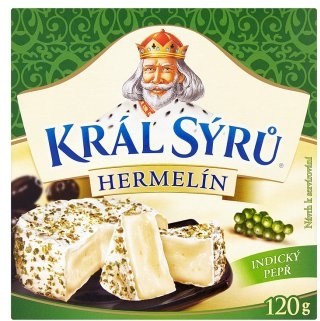 Marketing produktu.Hermelín Král Sýrů so zeleným korením odporúčame podávať s bielim vínom Pinot Gris, hruškou a chrumkavými krekrami.Marketing značky.Úspešný príbeh značky Král sýrů sa píše už viac ako 90 rokov a stále nekončí. Dnes je Kráľ Syrov vnímaný ako najlepší hermelín na trhu, ako delikatesa, ktorej krémová chuť a konzistencia perfektne dopĺňa vybrané druhy ušľachtilých vín. Téme párovanie syra a vína sa Kráľ Syrov intenzívne venuje, a otvára tak gurmánom stále nové a nové možnosti. Ako párovať syry s vínom nájdete na našich webových stránkach www.kralsyru.cz.Marketing výrobcu.Savencia Fromage & Dairy, a. s. je francúzska rodinná spoločnosť, ktorá pôsobí v Českej republike a na Slovensku od roku 1993. V súčasnosti je v oboch krajinách lídrom na trhu syrárskych a mliečnych špecialít, a to predovšetkým vďaka jedinečnej kvalite a nezameniteľnej chuti svojich výrobkov. Na slovenskom trhu spoločnosť Savencia Fromage & Dairy, a. s. zastrešuje známe značky ako napríklad Liptov, Bambino, Lučina, Pribináček, Král Sýrů, Lunex, a ďalšie.Mäkký zrejúci plnotučný syr s bielou plesňou na povrchu ochutený zeleným korením.Zloženie.Mlieko, Zelené korenie 1,8 % (ošetrené ionizujúcim žiarením), Soľ, Mliekarenské kultúry, Plesňová kultúra Penicillium candidum, Sušina: 48 %, Tuk: 25,5 %.Obsahuje : Mlieko.