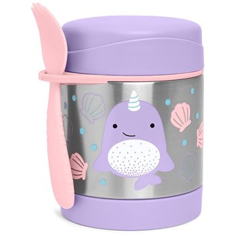 Detská termoska na jedlo, nerezová, objem 325 ml, s detskou vidličkou, s tesniacim viečkom a vhodné do mrazničky.Nerezová detská termoska s vidličkou a tesniacim viečkom Skip Hop Zoo Narval s objemom 325 ml udrží pripravené jedlo nielen teplé, ale aj studené. Teplý pokrm uchová až 7 hodín a studený až 5 hodín, a to v závislosti od teploty jedla a vonkajšej teploty. Termoska obsahuje praktickú vidličku a lyžičku v jednom, ktorú môžete jednoducho zavesiť do držadla. Deti si ju obľúbia pre roztomilý dizajn fialovo-ružovej farby s veselým obrázkom zvieratka Narvala jednorohého. Termoska Skip Hop Zoo Narval je vyrobená z prvotriednej nerezovej ocele, neobsahuje BPA, PVC a ftaláty a je vhodná pre deti od 12 mesiacov. Skvelý pomocník rodičov najmä pri cestovaní či výletoch, kedy desiatu či obed pre deti môžu vziať jednoducho so sebou.Kľúčové vlastnosti detskej termosky na jedlo s vidličkou a tesniacim viečkom Skip Hop Zoo Narval 12m+Nerezová termoska na jedlo Skip Hop.