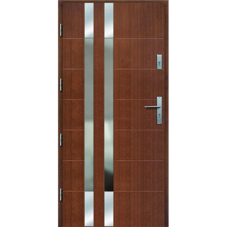 Koeficient tepelné prostupnosti: pro dveře tl. 72 mm = Ud 1,2 W/m2K pro dveře tl. 82 mm = Ud 0,9 W/m2K pro dveře tl. 102 mm (nizkoenergetické) = Ud 0,75W/m2K KONSTRUKCE Tloušťka křídla 72, 82 nebo 102 mm. Těsnění na křídle a zárubni. Polodrážkové provedení. Dveře jsou opláštěny voděodolnou kompozitní deskou. Výplň křídla tvoří termoizolační polyuretanová pěna. Rám dveří je vyroben z masivních profilů dřeva borovice + meranti nebo borovice + dub. Zesílení rámu dveří ocelovou výztuhou. Pantová strana dveří a zárubně mají bezpečnostní žebro proti vysazení dveří. Další technické informace. ZÁRUBEŇ Spojené masivní rámy borovice jsou pokryty dýhou z borovice, dubu nebo meranti. POVRCHOVÁ ÚPRAVA Třívrstvé speciální hydrodynamické vodou ředitelné barvy podle palety barev Rostra nebo RAL. Nerezové dekorační elementy pro modely: P42, P44, P46, P48, P57, P58, P60, P66, P68, P70, P81, P95, P97, P98, P99, P100, P101, P102, P103, P104, P105, P106, Pozor: v ceně na venkovní stranu, vnitřní - za příplatek. ROZMĚRY Standardní rozměry viz technické informace. Atypické rozměry: viz příplatkyChcete-li objednat atypický rozměr, napište prosím do poznámky Vámi požadované rozměry a my Vám vyhotovíme individuální nabídku. Příplatky na vchodové dveře (PDF). STANDARDNÍ VYBAVENÍ Součástí balení je dřevěná rámová zárubeň. 2 oddělené tříbodové zámky pro dveře tl.72 mm (rozteč 72 mm), lištový tříbodový zámek na 1 vložku pro dveře tl. 82 mm(rozteč 72 mm) a tl. 102 mm(rozteč 92 mm) Čtyři kusy 3D seřiditelných pantů. Hliníkový prah s termoizolační vložkou nebo dřevěný. Tepelná prostupnost dveří - Osvědčení o zkoušce pro dveře tloušťky 72 mm (PDF). Tepelná prostupnost dveří - Osvědčení o zkoušce pro dveře tloušťky 82 mm (PDF). Tepelná prostupnost dveří - Osvědčení o zkoušce pro dveře tloušťky 102 mm (PDF). KOVÁNÍ Bezpečnostní kliky ke dveřím můžete objednat zde. Kování je potřeba zvolit dle počtu zámků ve dveřích, viz odstavec STANDARDNÍ VYBAVENÍ. Bezpečnostní vložky si můžete prohlédnout v příplatcích na vchodové dveře. PROSKLENÍ Dveře tl. 72 a 82 mm: bezpečnostní 3-sklo s úpravou REFLEX BRONZ pro všechny modely, mimo P42, P44, P48, P56, P57, P60, P66, P68, P70, kde je 4-sklo. Dveře tl. 102 mm: bezpečnostní 4-sklo s úpravou REFLEX BRONZ pro všechny modely, mimo P42, P44, P48, P56, P57, P60, P66, P68, P70, kde je 5-sklo. REFLEX BRONZ - známý svou velmi trvanlivou odrazivou vrstvou, která odolává extrémním podmínkám prostředí. Disponuje mimořádnými vlastnostmi světelné reflexe, rovněž reflexe slunečního záření je velmi účinná. Nabízíme aplikované na bronzovém skle. ODSTÍNY Povrch dýhovaných dveří se může lišit barvou, strukturou a konzistencí. I v případě, že je dýha z jednoho dřeva, mohou existovat rozdíly, je to podmíněno vlastnostmi dřeva. Prezentované v e-shopu odstíny dveří jsou určeny pouze pro znázornění a nemohou být použity jako vzory barev.