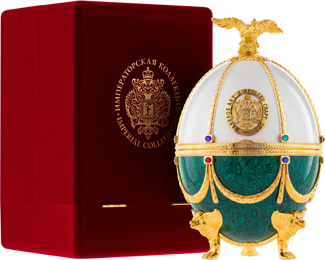Imperial Collection Faberge Pearl and Emerald (Perla a Smaragd) je výnimočné spojenie kvalitného alkoholu a umenia. Jedinečná ruská vodka v elitnom balení vajíčka, v štýle diela známeho ruského klenotníka Carla Fabergeho. Karafa a poháre sú tvorené z benátskeho skla, tak ako aj vajce, ktorého povrch je pokrytý farebným smaltom, čo simuluje prírodný minerál smaragd a pravú perlu. Zdobené detaily, nohy v tvare okrídlených levov, orol prevyšujúci vajíčko a reliéfna kovová vložka umiestnená na povrchu vajca sú pokryté 24-karátovým zlatom. Súprava obsahuje pozlátenú konzolu na poháre a ozdobnú čiapku nad fľašou, ktorá je zdobená veľkým rubínovým štrasom.