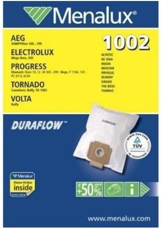 Súprava 5 kusov vreciek MENALUX 1002 vhodných pre vybrané modely AEG, Electrolux, Tornado, Volta, Zanussi. Vrátane 1 kusu mikrofiltra.