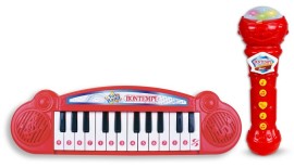 Hudobná hračka pre dievčatá aj chlapcov, vhodné od 3 rokov Máte doma malého muzikanta? Potom ho určite potešíte hudobnou hračkou Bontempi Mini klávesnica a mikrofón Karaoke. Elektronická Bontempi Mini klávesnica má 24 klávesov, vie zahrať 23 demosongov a má tri módy: selektorová nota, ukážka a prehrávanie ...viac