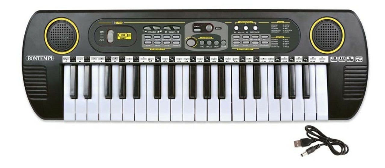 Digitálna klávesnica s 37 klávesmi 6 vopred nahratých skladieb 10 zvukov 10 rytmov Klávesy na výber demo skladieb, zvukov a rytmov 8-notová polyfónia OKON (funkcia učenia) Funkcia nahrávania/prehrávania Ľahko spravovateľné akordy (Easy akord) Výber hudobných nôt/zvukov bubnov na klaviatúre Efekty: Sustain, Vibrato Ovládanie hlasitosti Úprava tempa Synchronizácia Čítanie skladieb MP3 na USB Flash disku Ovládanie hlasitosti a sekvencie pre skladby MP3 Zásuvka pre Kábel USB-DC (dodáva sa) alebo pre sieťový adaptér (nie je súčasťou dodávky) Automatické vypnutie Napájanie: cez sieťový adaptér (nie je súčasťou dodávky) alebo cez kábel USB-DC (súčasťou balenia) na pripojenie k napájacej banke, počítaču, telefónu nabíjačka atď. (nie je súčasťou balenia) alebo 4 x 1,5V batérie typu R6/AA - (nie sú súčasťou balenia) Zásuvka pre slúchadlá (nie je súčasťou dodávky) USB zásuvka pre Flash disk (nie je súčasťou dodávky) Rozmer: 546x51x172 mm.