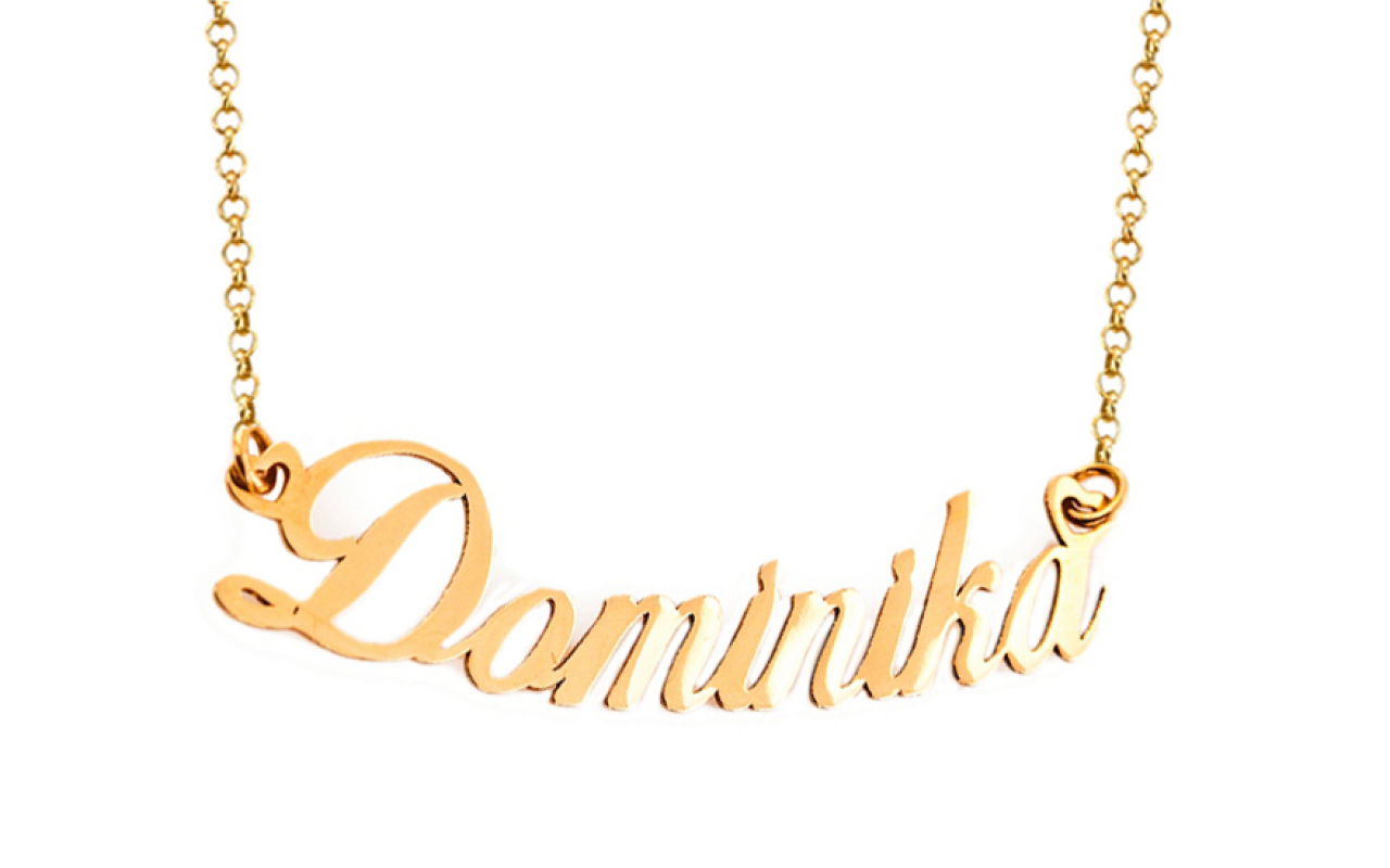 Originálny šperk z našej produkcie, pre jedinečnú možnosť odlíšiť sa, vyrobený zo žltého 14 karátového zlata. Výška nápisu je 10 mm, jeho šírka 45 mm, dĺžka je variabilná, môžete si ju podľa potreby prispôsobiť od 40 do 45 cm. Retiazka vzoru Rolo je pevná a v strede dekorovaná menom Dominika. Použité zapínanie retiazky je na skákaví krúžok. Retiazka s nápisom či menom je jednoznačne tým pravým darčekom k mnohým významným príležitostiam.