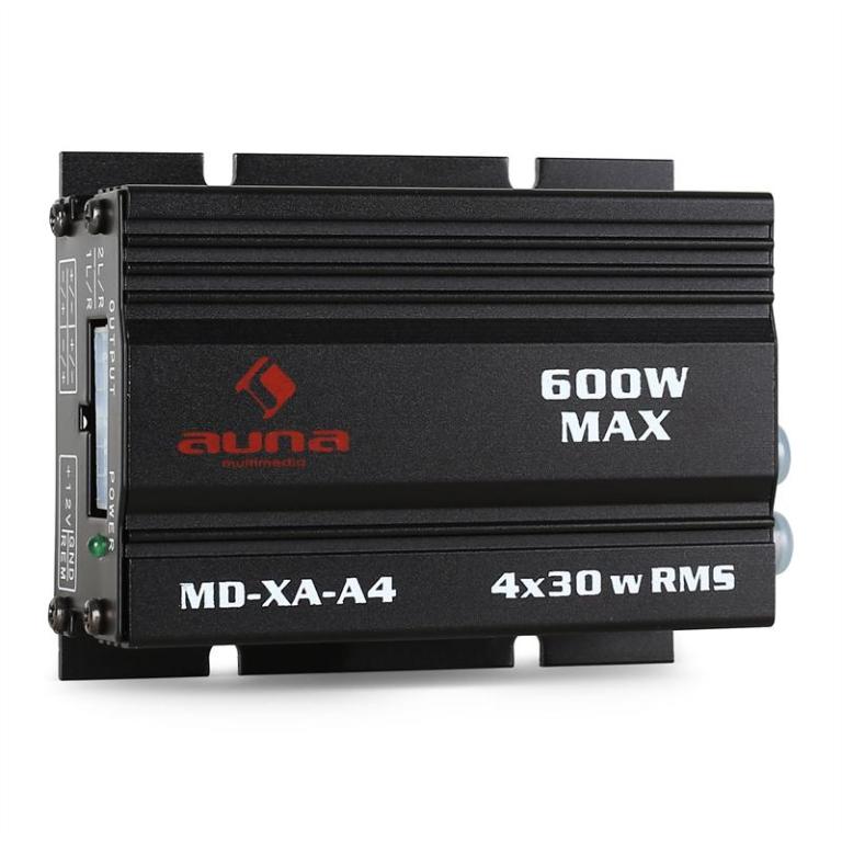 oneConcept XA-A4 je miniatúrny 4-kanálový zosilňovač, ktorý má napriek malým rozmerom veľký výkon. Šetrí miesto a dobre vyzerá. Po technickej stránke Vás prekvapí výborným výkonom 600 W max. (120 W RMS) a vďaka nastaviteľnému low-pass filtru a high-pass filtru splní všetky Vaše očakávania.